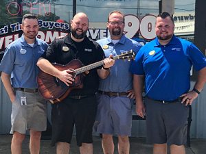 Car-Mart’s leadership recently recognized Cleveland for playing at customer appreciation events and company meetings through the years. “One day, they showed up at my lot and presented me with a guitar for entertaining both customers and associates,” he says of the Taylor Acoustical Electric Guitar.